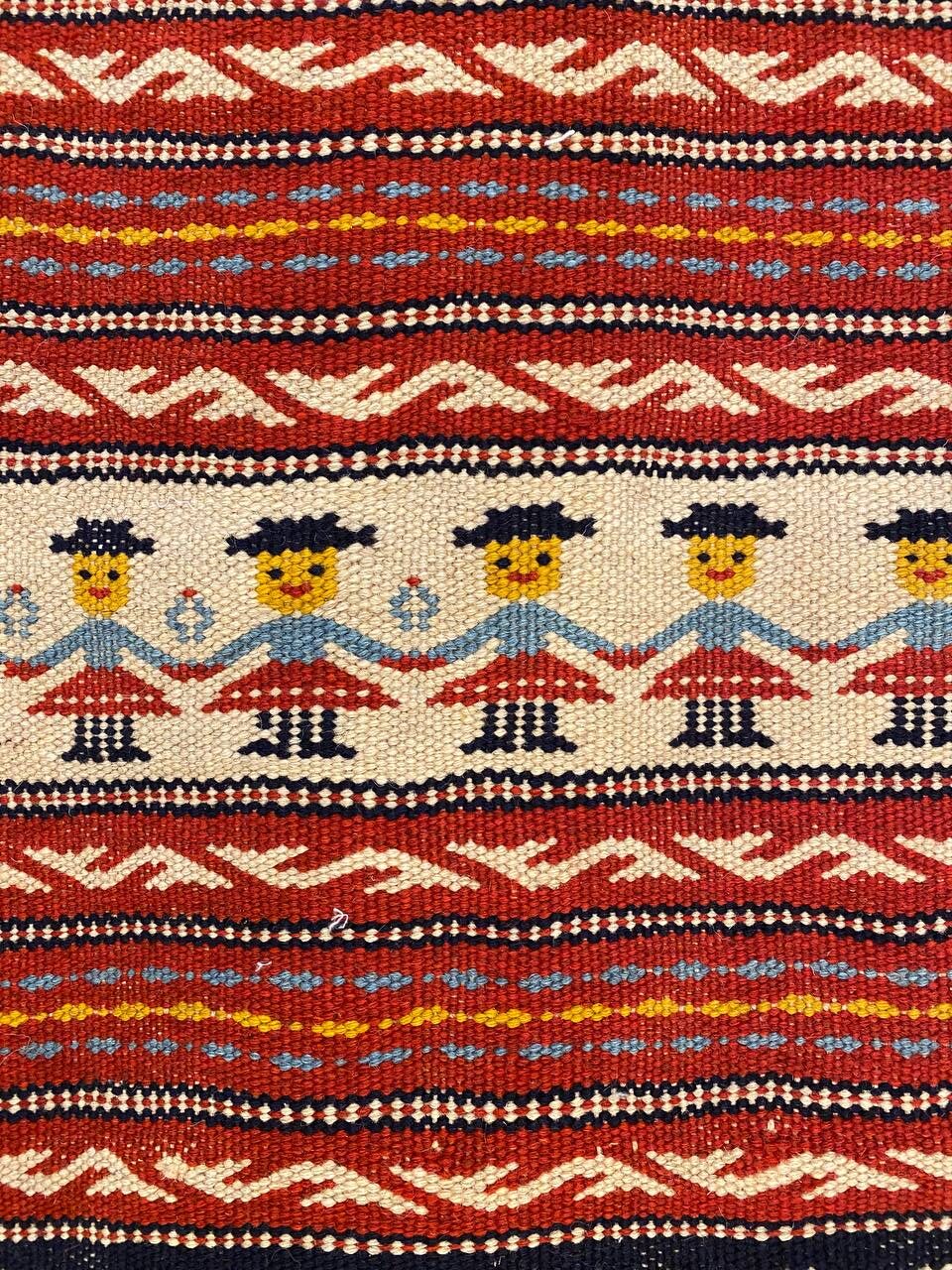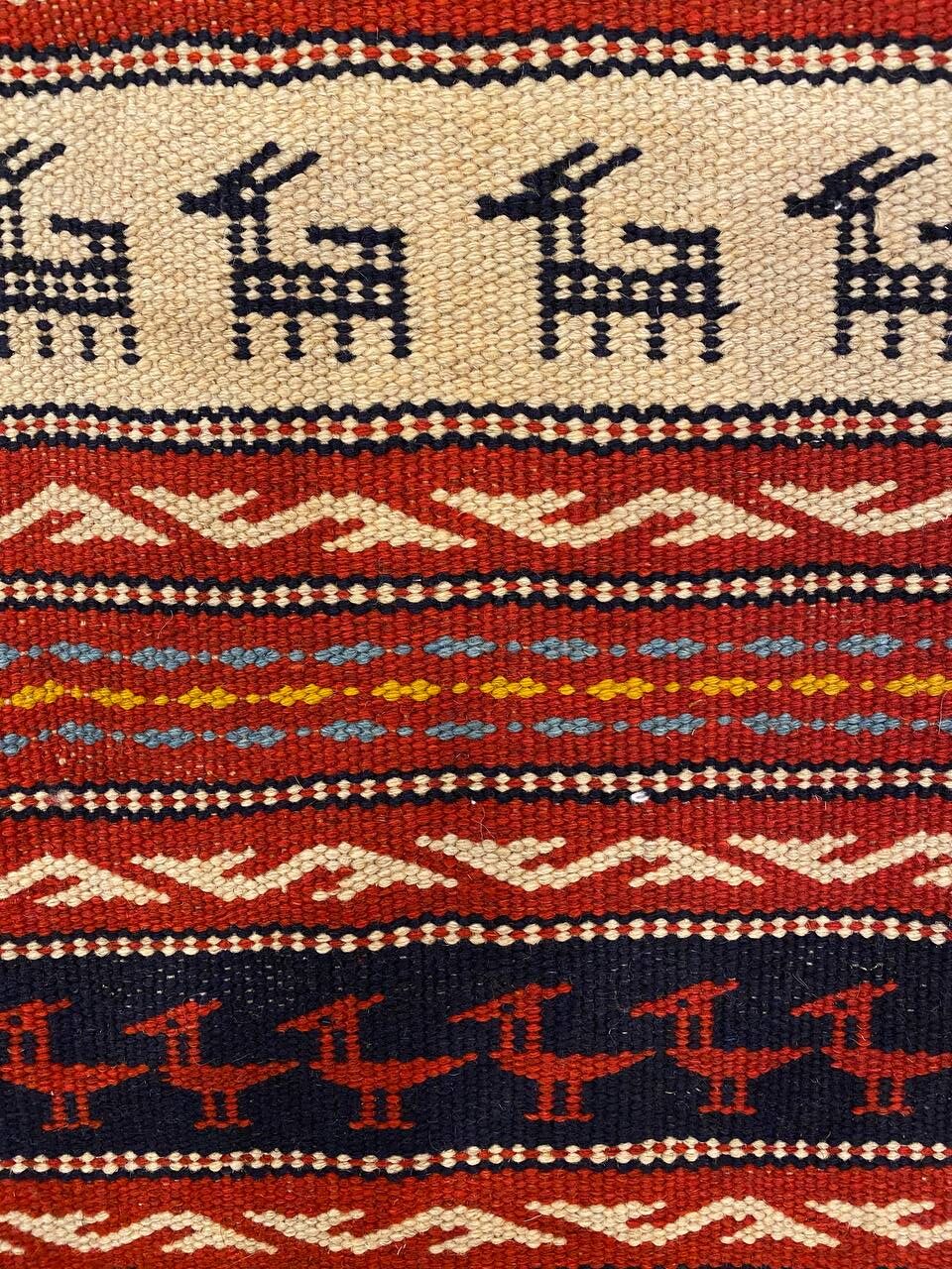 Un esemplare particolare di sumak Quchan, realizzato con la tecnica delle trame avvolte, si distingue per la sua finezza. La composizione decorativa raffigura figure umane, animali e uccelli, dai colori caldi e vivaci, tessuti con lana di ottima qualità filata a mano. Questo manufatto è munito di attestato di provenienza e autenticità.
