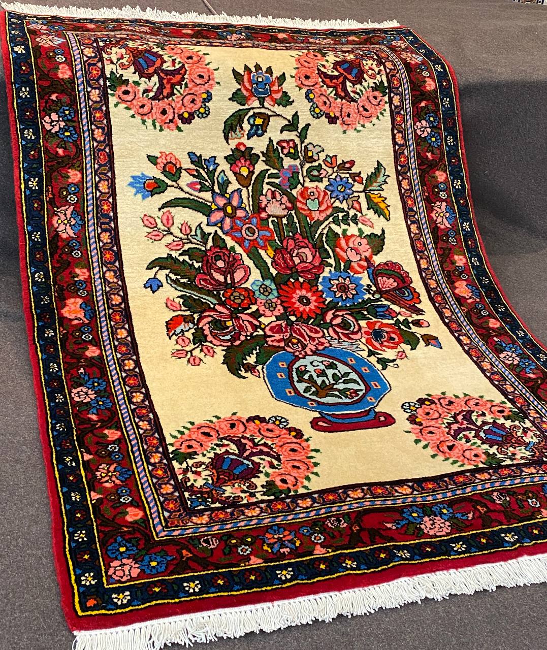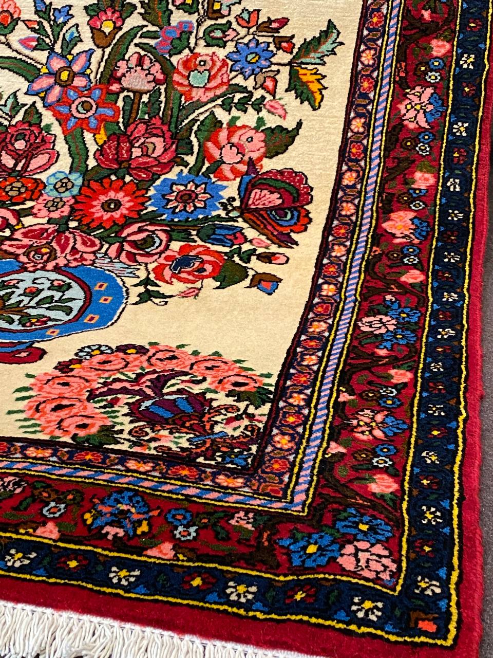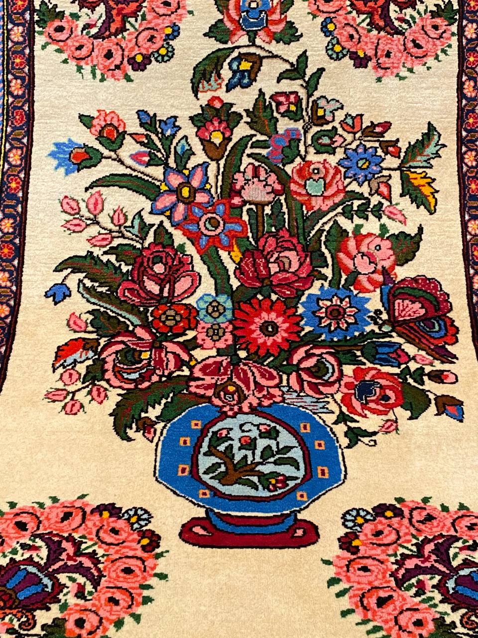 Un inusuale esemplare Bakhtiari è di ottima qualità, rappresenta un impianto floreale decorativo a vaso ed i colori allegri con la lana filato a mano. Questo manufatto è munito dall’attestato di provenienza e di autenticità.