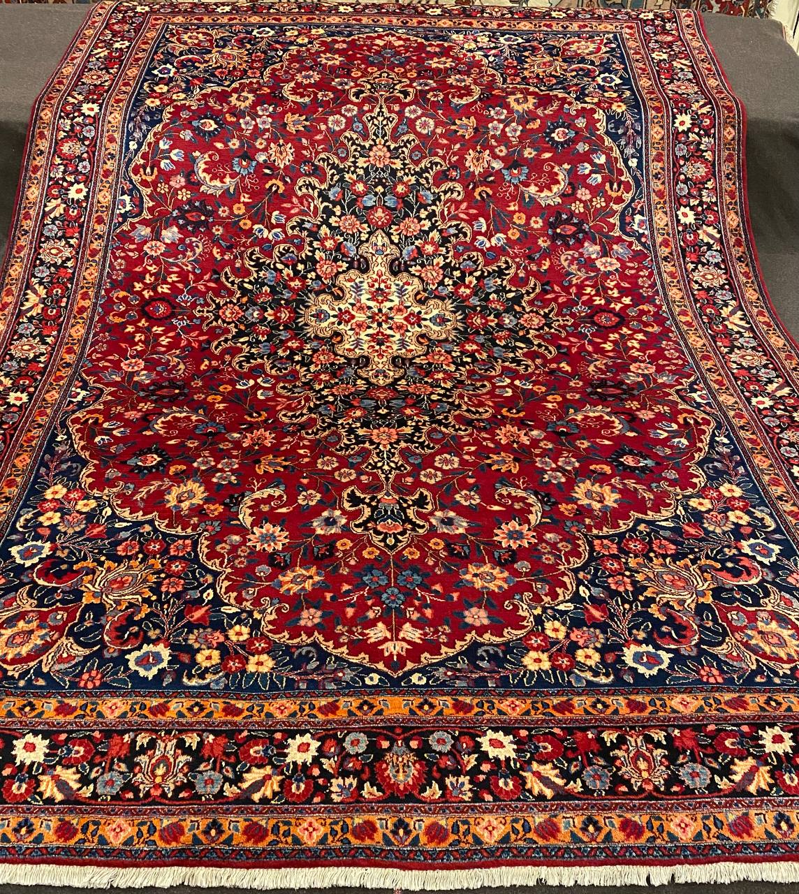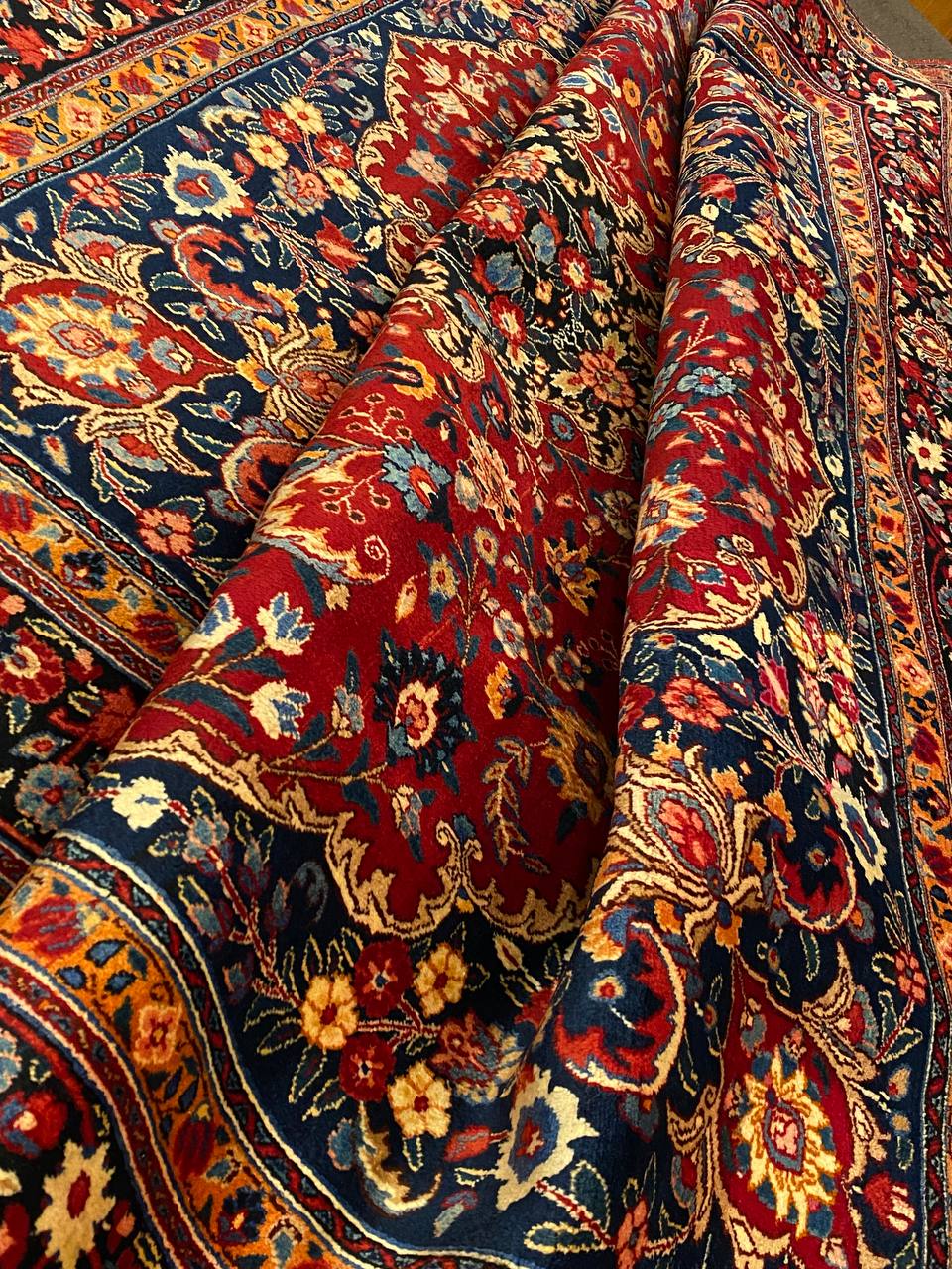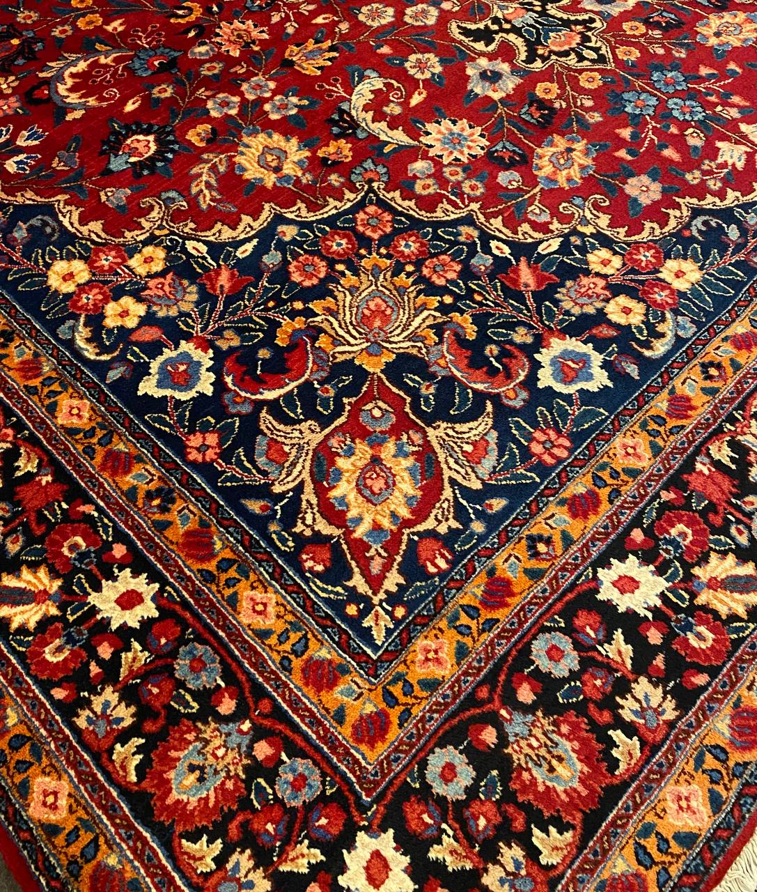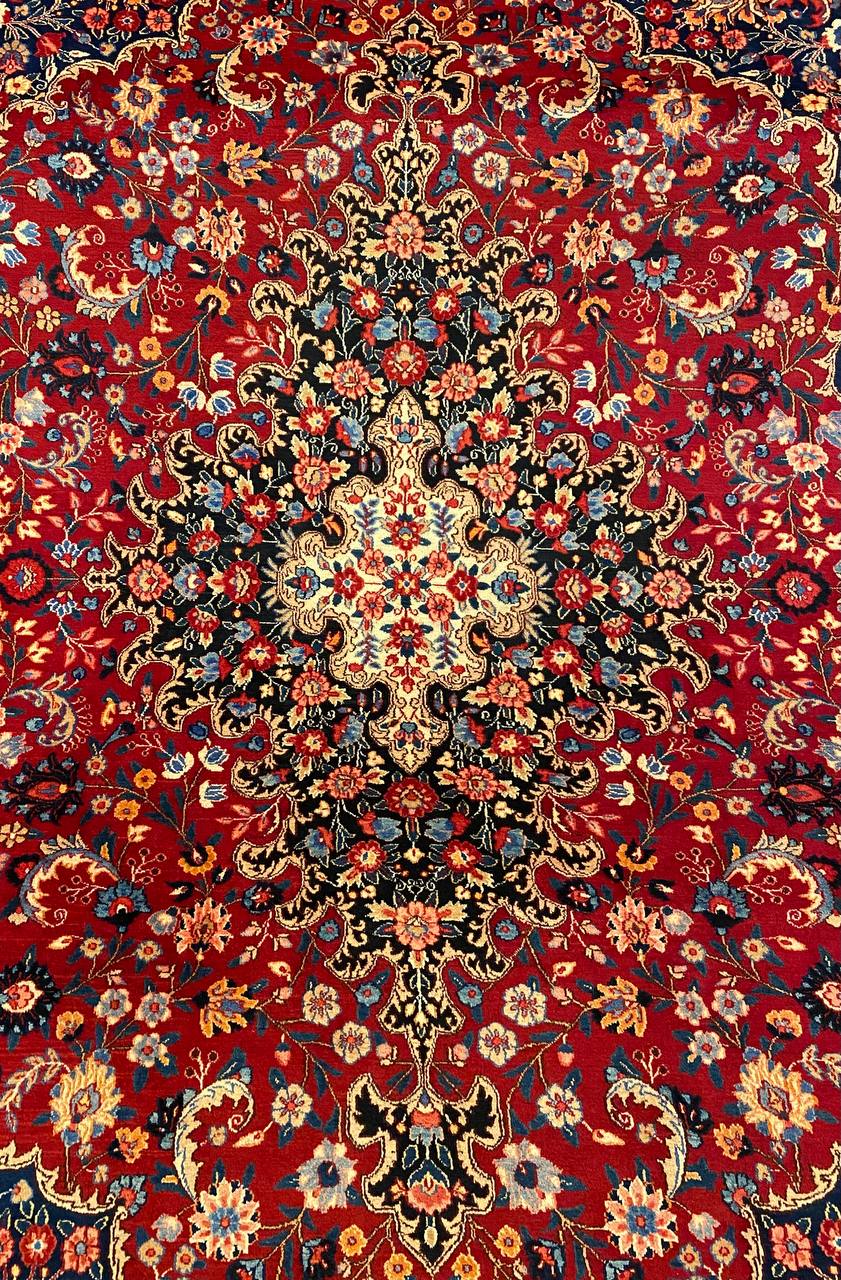 Questo eccellente esemplare Dorokhsh semi antico eseguito alla perfezione con un disegno fitto di arabeschi floreali e un ricco medaglione centrale. È firmato in un cartiglio inserito nella bordura in alto dal maestro “Vakili”, lo stato di conservazione è perfetto ed è munito dell’attestato di provenienza e di autenticità
