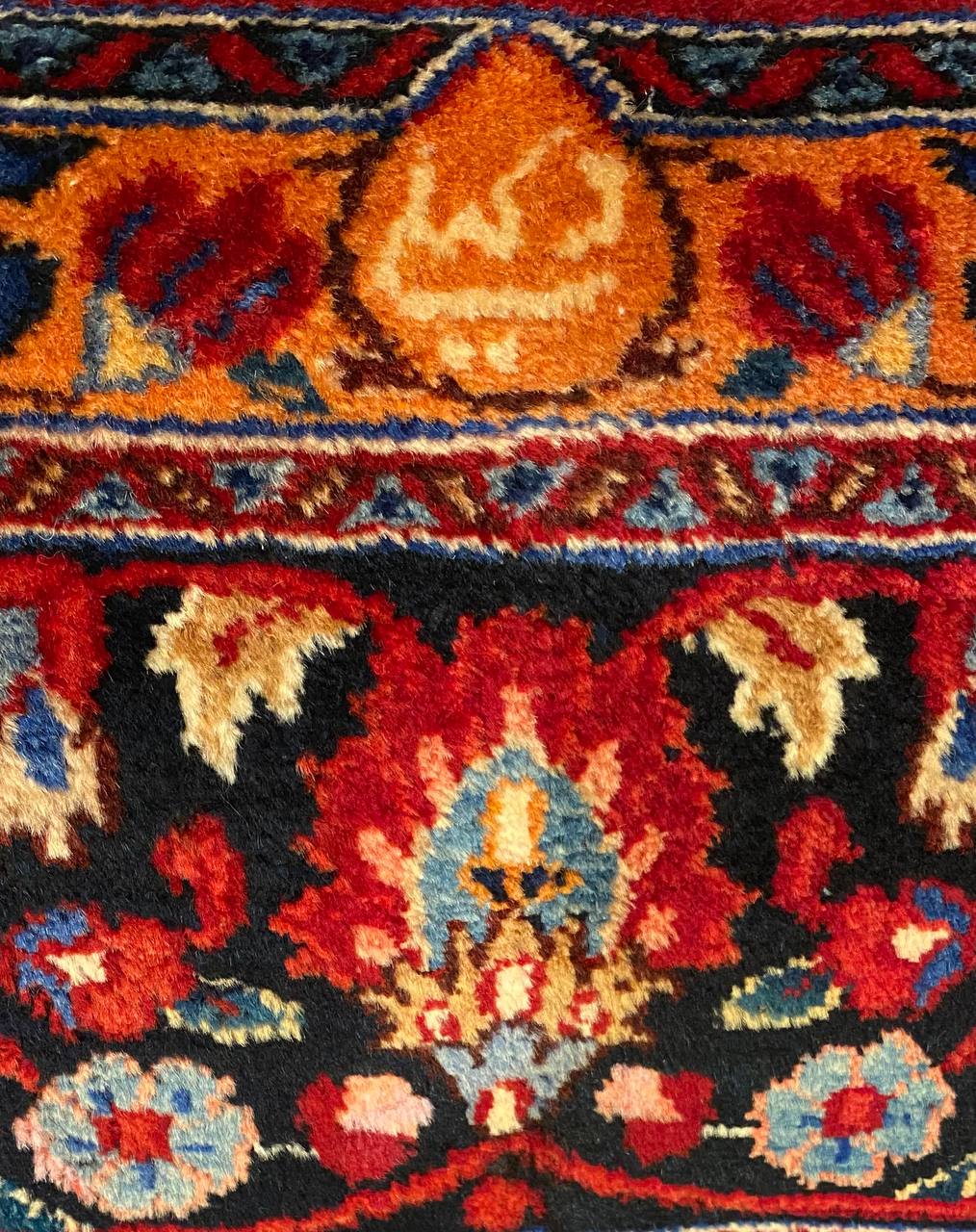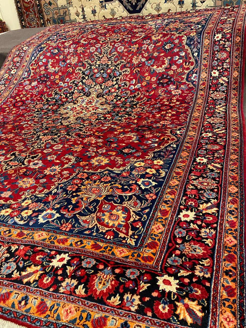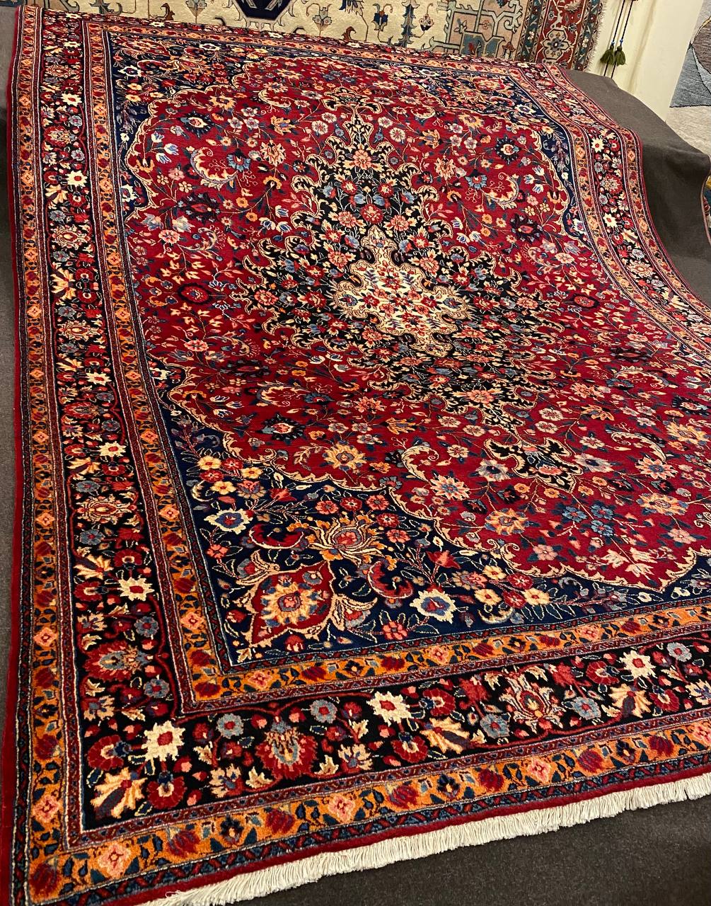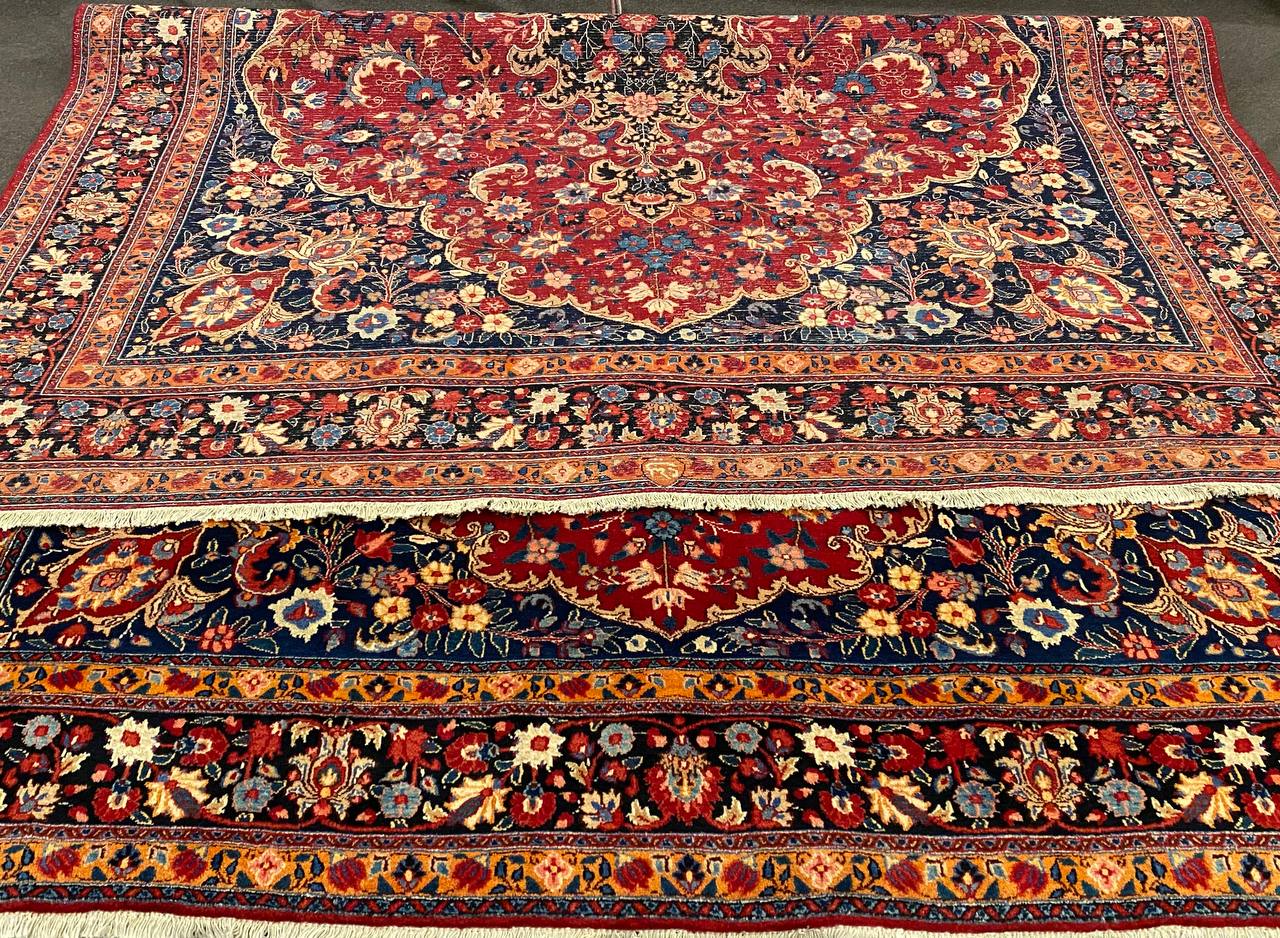 Questo eccellente esemplare Dorokhsh semi antico eseguito alla perfezione con un disegno fitto di arabeschi floreali e un ricco medaglione centrale. È firmato in un cartiglio inserito nella bordura in alto dal maestro “Vakili”, lo stato di conservazione è perfetto ed è munito dell’attestato di provenienza e di autenticità