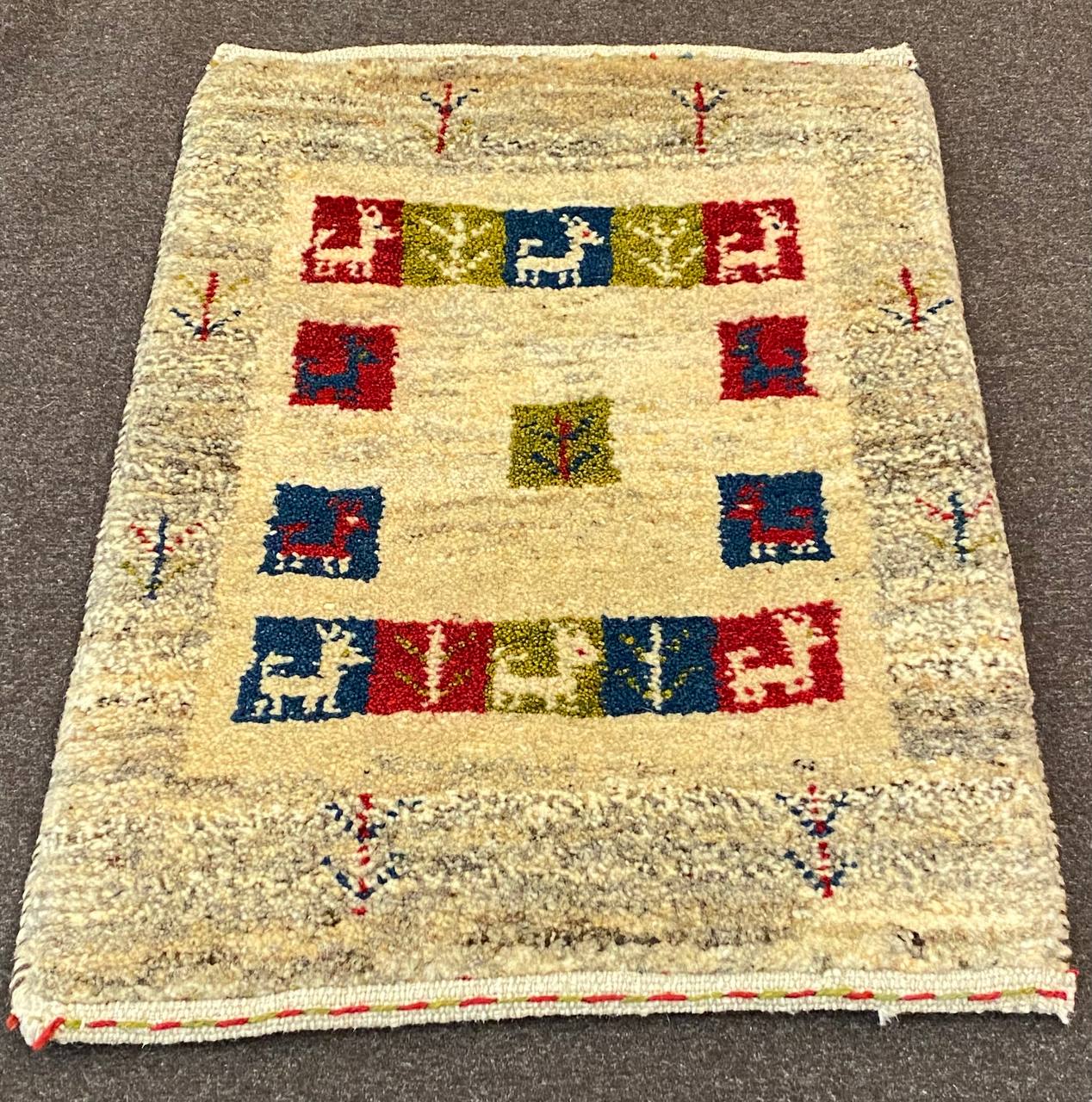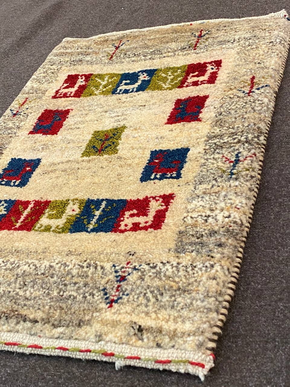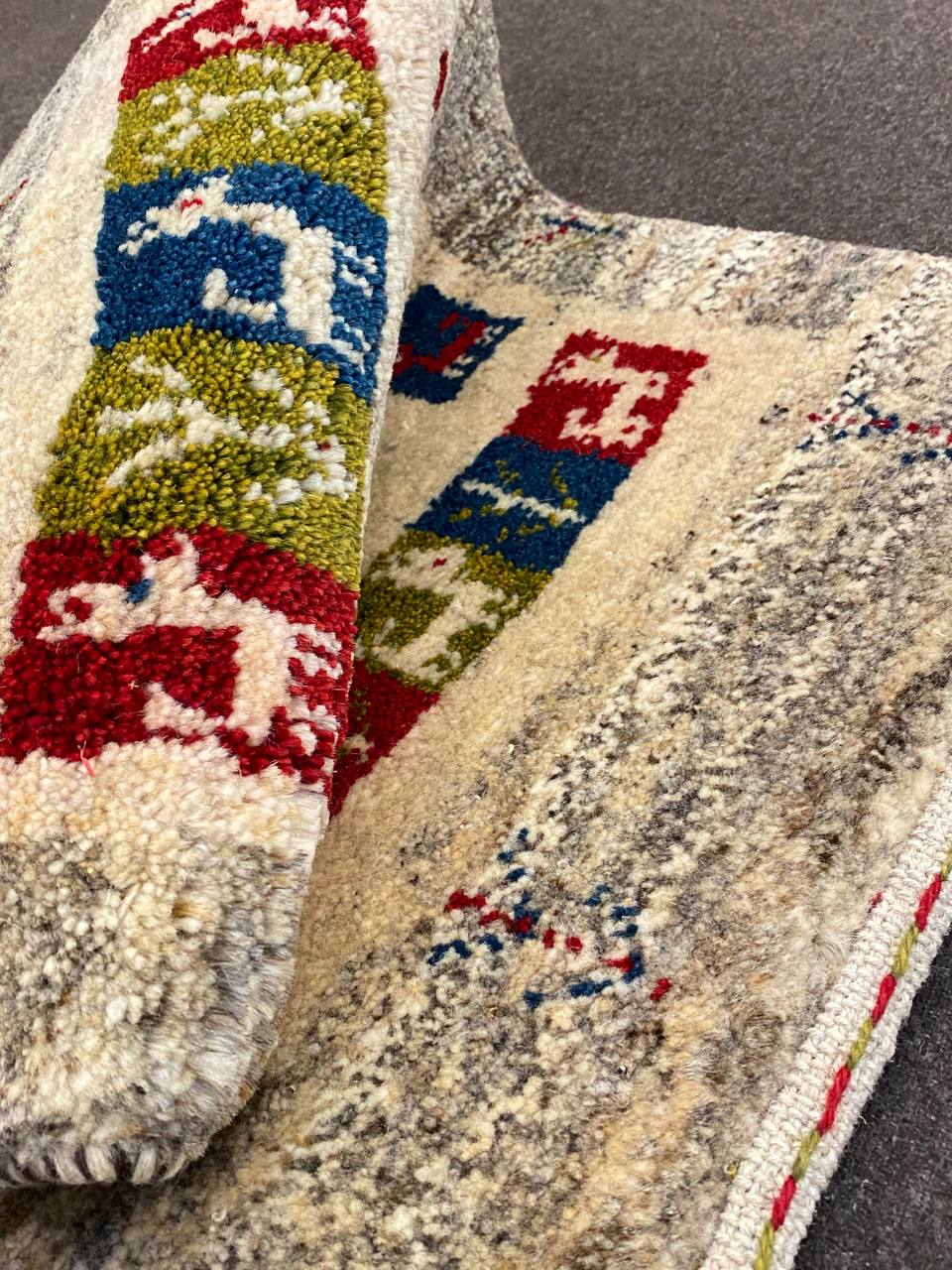 I Gabbeh sono annodati dai nomadi delle tribù di Qashqai. Sono realizzati con filato naturale di lana lavorata a mano e tutti i colori sono creati con tinta naturale, generalmente vivaci e contrastanti. Sono tappeti di vello alto, nodo grosso. I disegni sono semplici, stilizzati e geometrici, ispirati dall’ambiente che li circonda, per questo motivo sono tappeti unici nel loro genere.