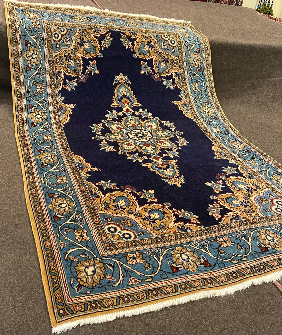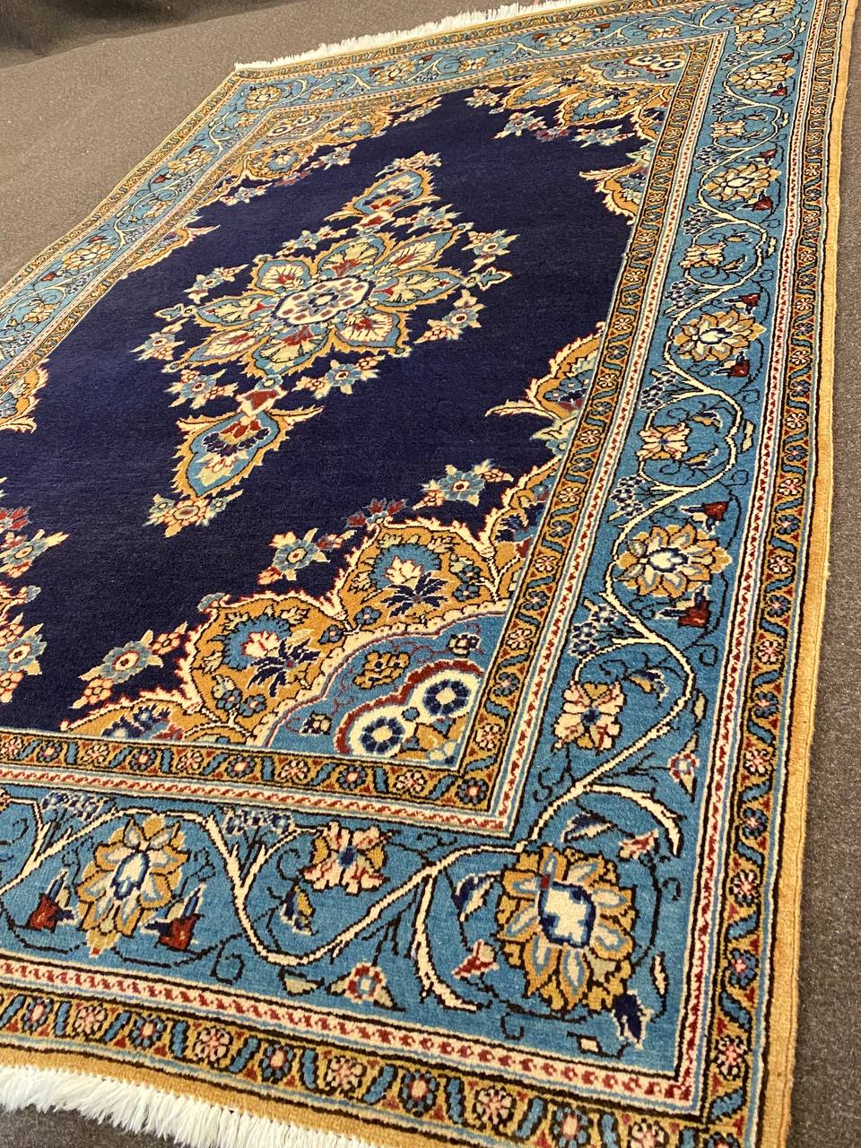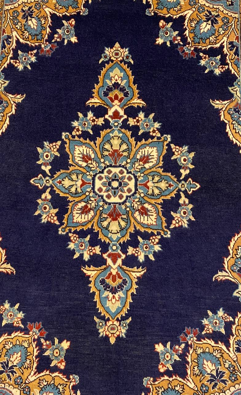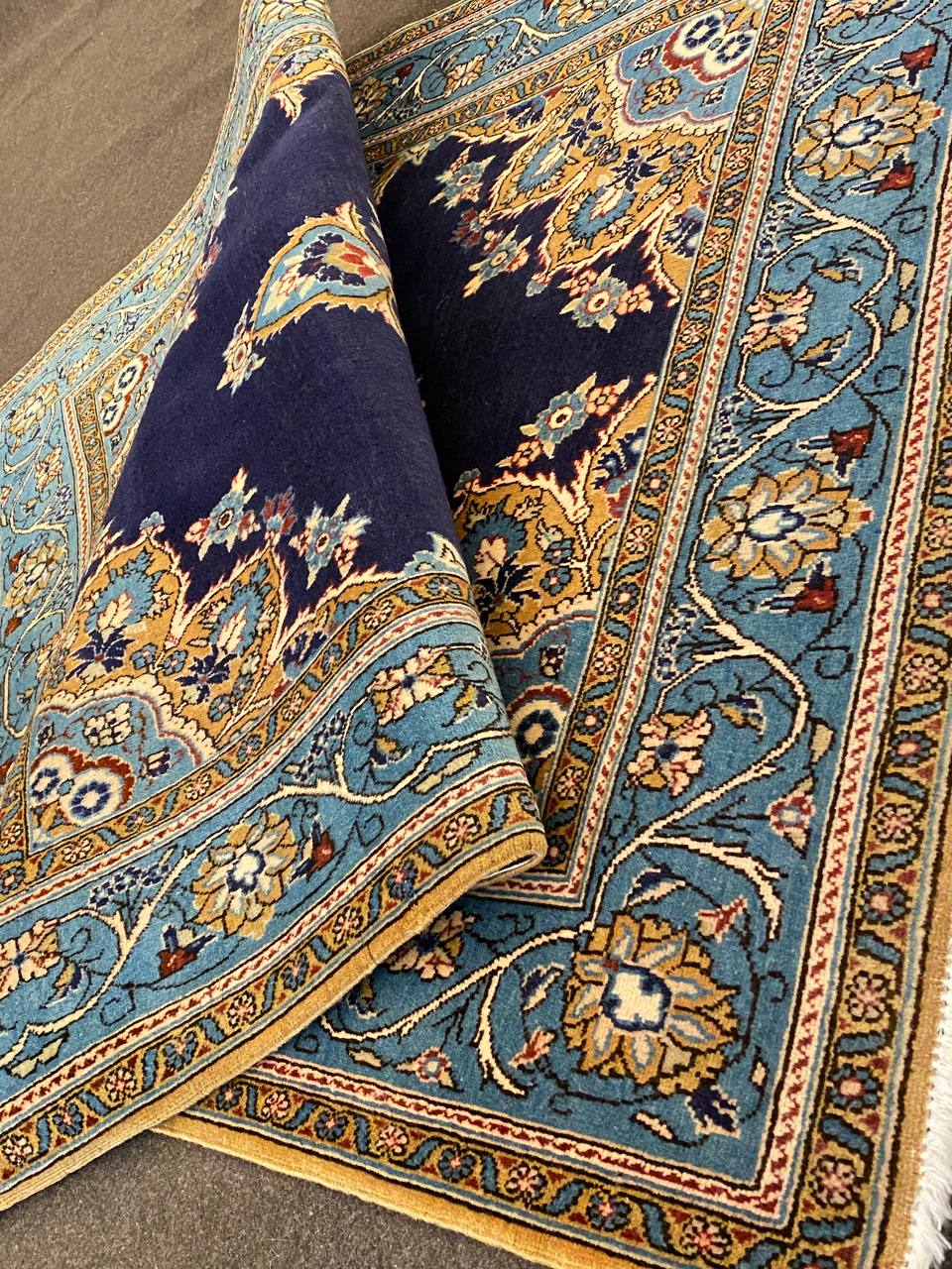 Questo elegante esemplare Qum degli anni settanta presenta una classica decorazione a medaglione arricchita da elementi floreali. Questo manufatto è accompagnato dall’attestato di provenienza e di autenticità.Qum antica città santa del Iran centrale. Grazie alla evoluta esecuzione tecnica ed alla varietà dei loro disegni, fanno parte dei tappeti persiani più noti. Tra i disegni più frequenti i tradizionali schemi a medaglione e a preghiera, con alberi e uccelli all’ interno della nicchia. Sono inoltre diffusi i disegni floreali a campo continuo altrettanto frequenti i Botteh. viene usato il nodo, asimmetrico e la densità di nodo è solitamente elevata. Il Qum adottano una vastissima gamma di colori, il bianco e lavorio ricorrono maggiormente nel campo mentre la decorazione è spesso a tinte molto vivaci l’azzurro e anche il verde.