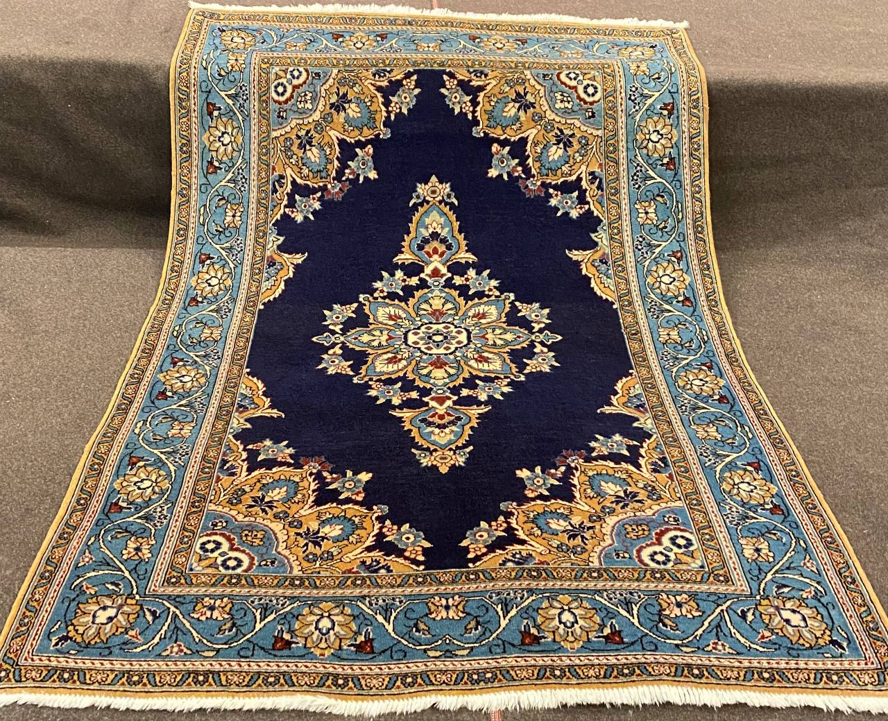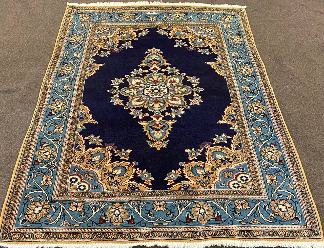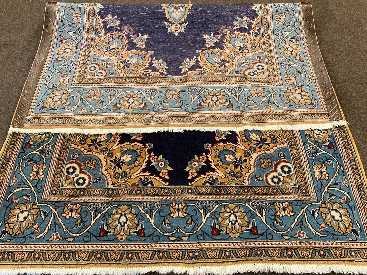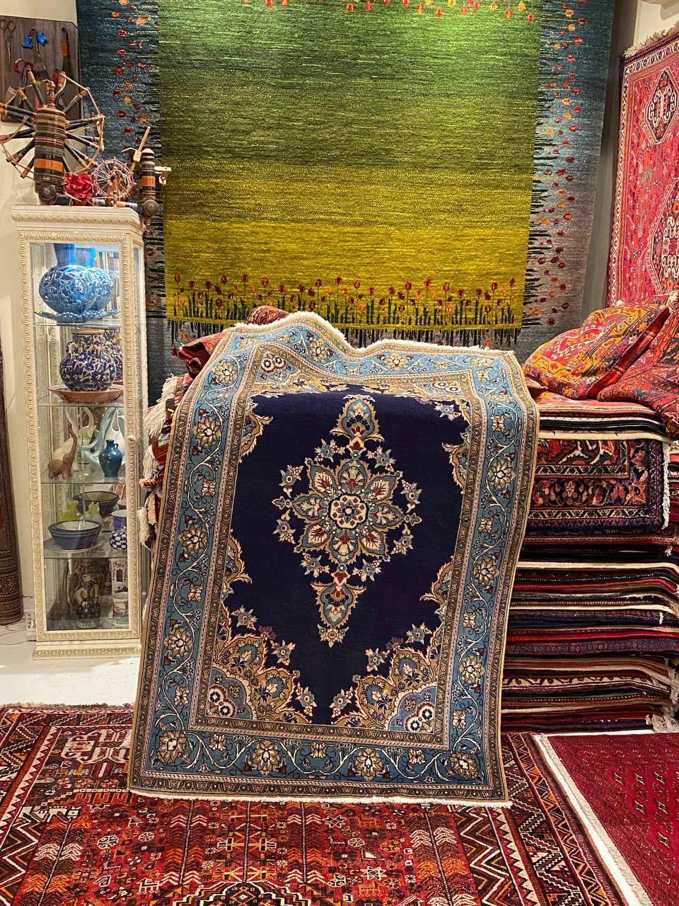 Questo elegante esemplare Qum degli anni settanta presenta una classica decorazione a medaglione arricchita da elementi floreali. Questo manufatto è accompagnato dall’attestato di provenienza e di autenticità.Qum antica città santa del Iran centrale. Grazie alla evoluta esecuzione tecnica ed alla varietà dei loro disegni, fanno parte dei tappeti persiani più noti. Tra i disegni più frequenti i tradizionali schemi a medaglione e a preghiera, con alberi e uccelli all’ interno della nicchia. Sono inoltre diffusi i disegni floreali a campo continuo altrettanto frequenti i Botteh. viene usato il nodo, asimmetrico e la densità di nodo è solitamente elevata. Il Qum adottano una vastissima gamma di colori, il bianco e lavorio ricorrono maggiormente nel campo mentre la decorazione è spesso a tinte molto vivaci l’azzurro e anche il verde.