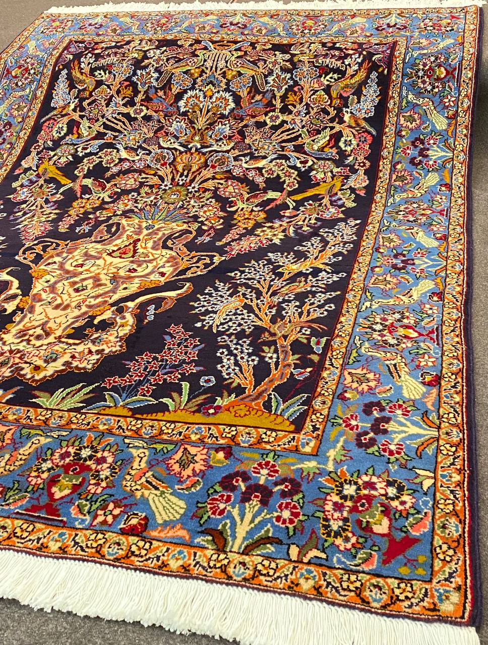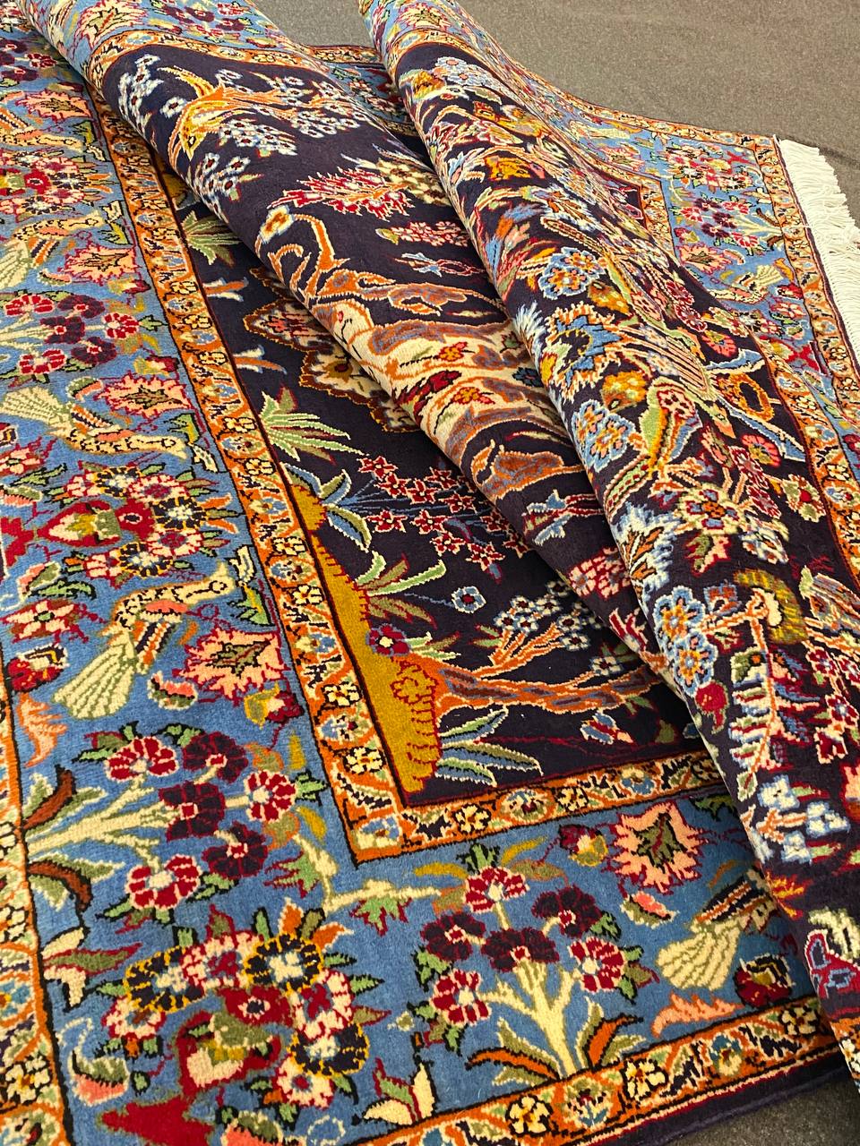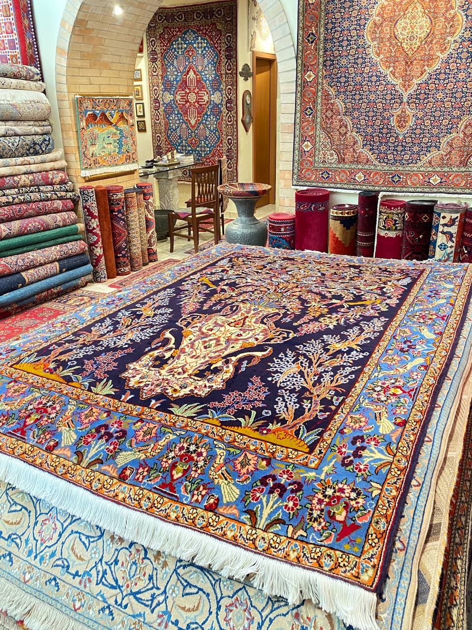 La citta Shahresa situata nella provincia di Isfahan nell’Iran centrale, è una delle aree di tessitura più riconoscibili per la produzione di tappeti in lana di alta qualità, una zona nota per la ricca tradizione artigianale e per l’uso di colorazioni naturali profonde I tappeti di Shahresa sono realizzati con nodo persiano e una struttura generalmente a doppia trama che conferisce solidità. La lana è morbida e resistente spesso tinta con pigmenti naturali che producono tonalità calde e armoniose. L’impianto decorativo unisce motivi “Islimi” e fiori “Khatai” in composizioni fluide, con elementi floreali più pieni. La palette tipica comprende blu notte, rosso lacca, crema, beige e tocchi di azzurro, creando un equilibrio visivo ricco e tradizionale.