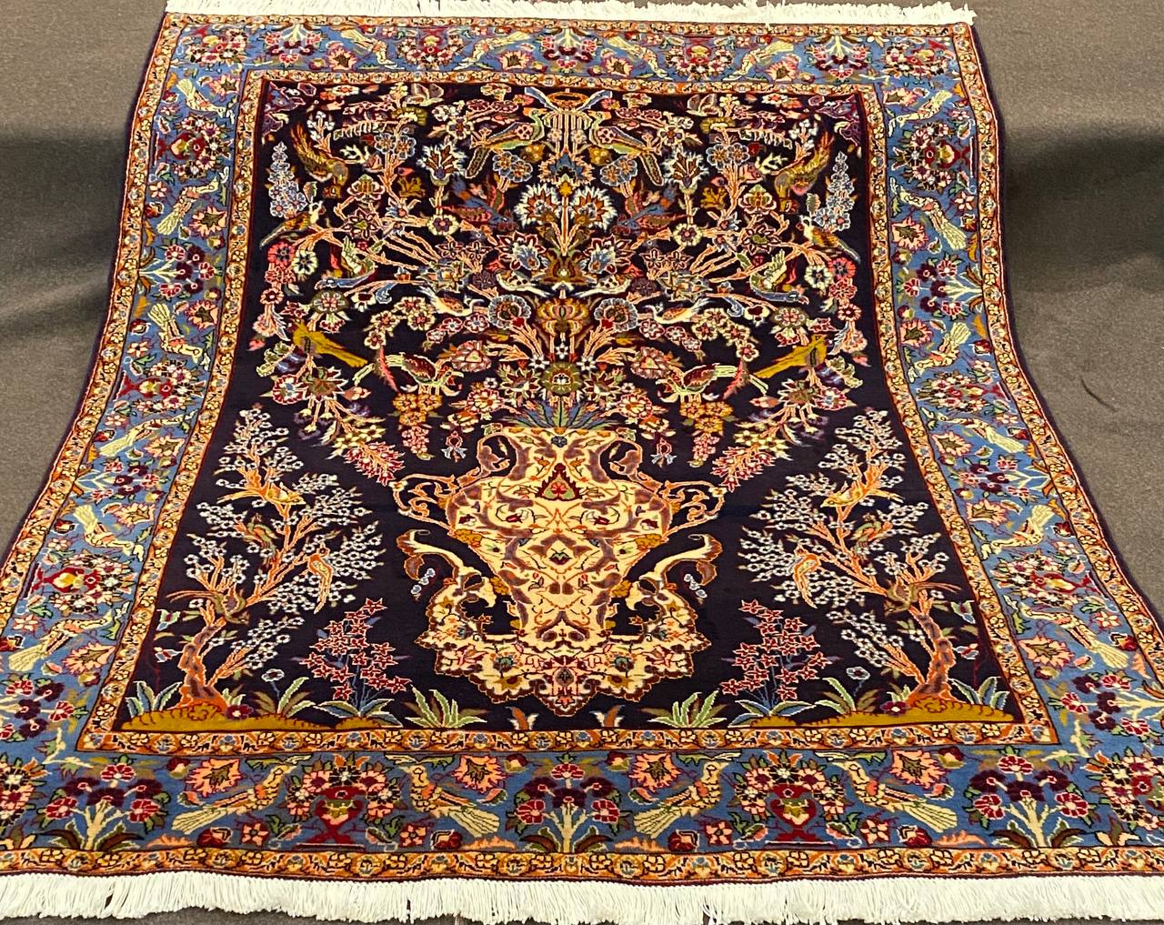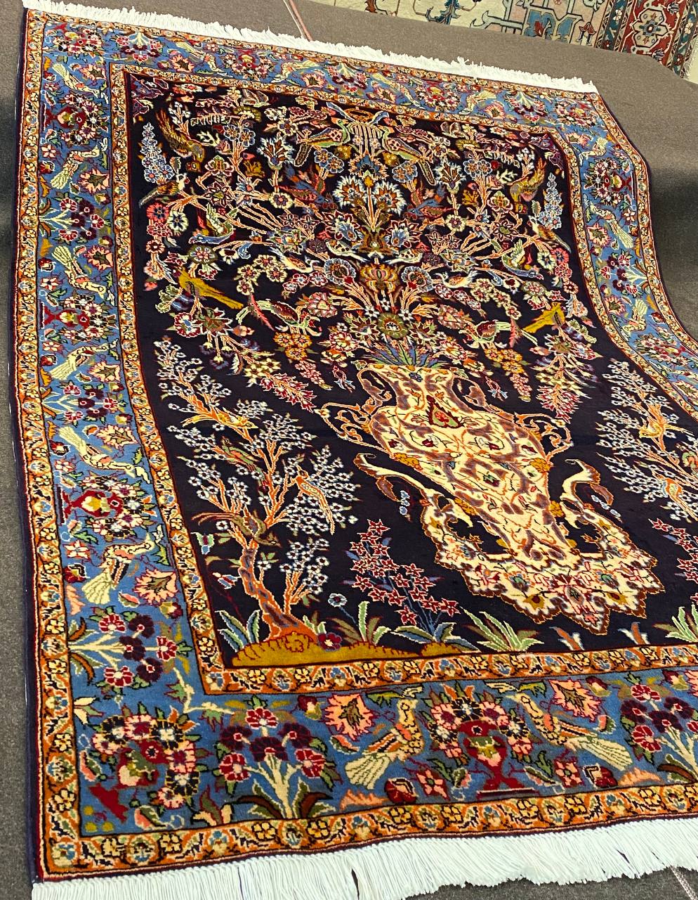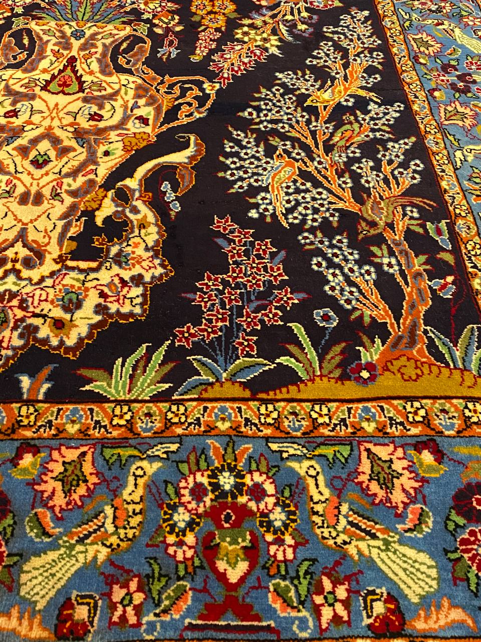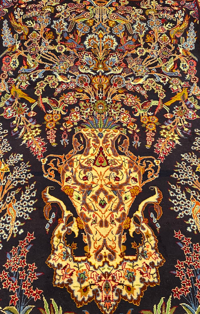 Questo raffinato tappeto, caratterizzato da un fondo blu notte e da un elegante vaso centrale rappresenta una delle espressioni più distintive dell’arte tessile di “Shahresa”. Alla base del tappeto un vaso si erge come una radice nata dalla terra dell’immaginazione. Da esso i fiori si sollevano, i rami si allungano verso l’alto e un giardino unilaterale sboccia lungo il percorso dello sguardo. La tavolozza calda, con tonalità di rosso lacca, crema, verde oliva e turchese mette in risalto l’identità aiutentica di questo manufatto. Questo elegante Shahresa è accompagnato dall’attestato di provenienza e di autenticità.
