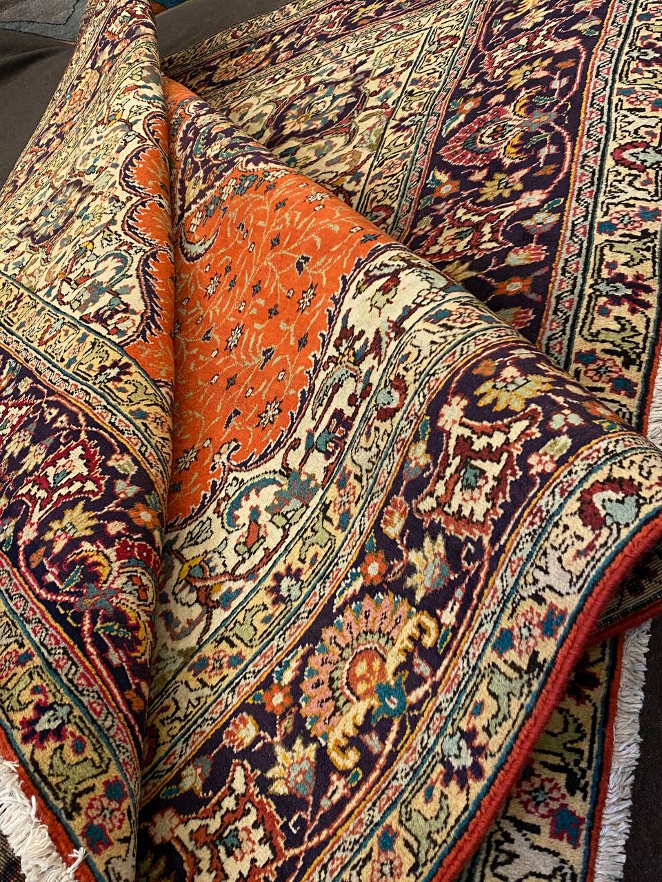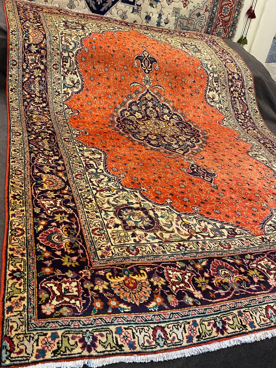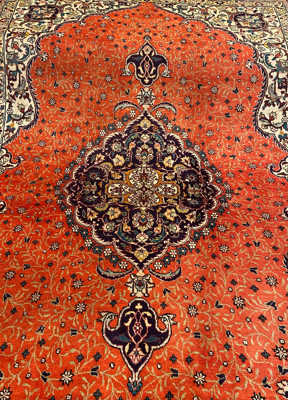 Questo esemplare Tabriz di vecchia manifattura è molto inconsueto con i colori caldi che donerà un tocco di eleganza a ogni ambiente. Lo stato di conservazione è ottimo ed è munito dell’attestato di provenienza e di autenticità.