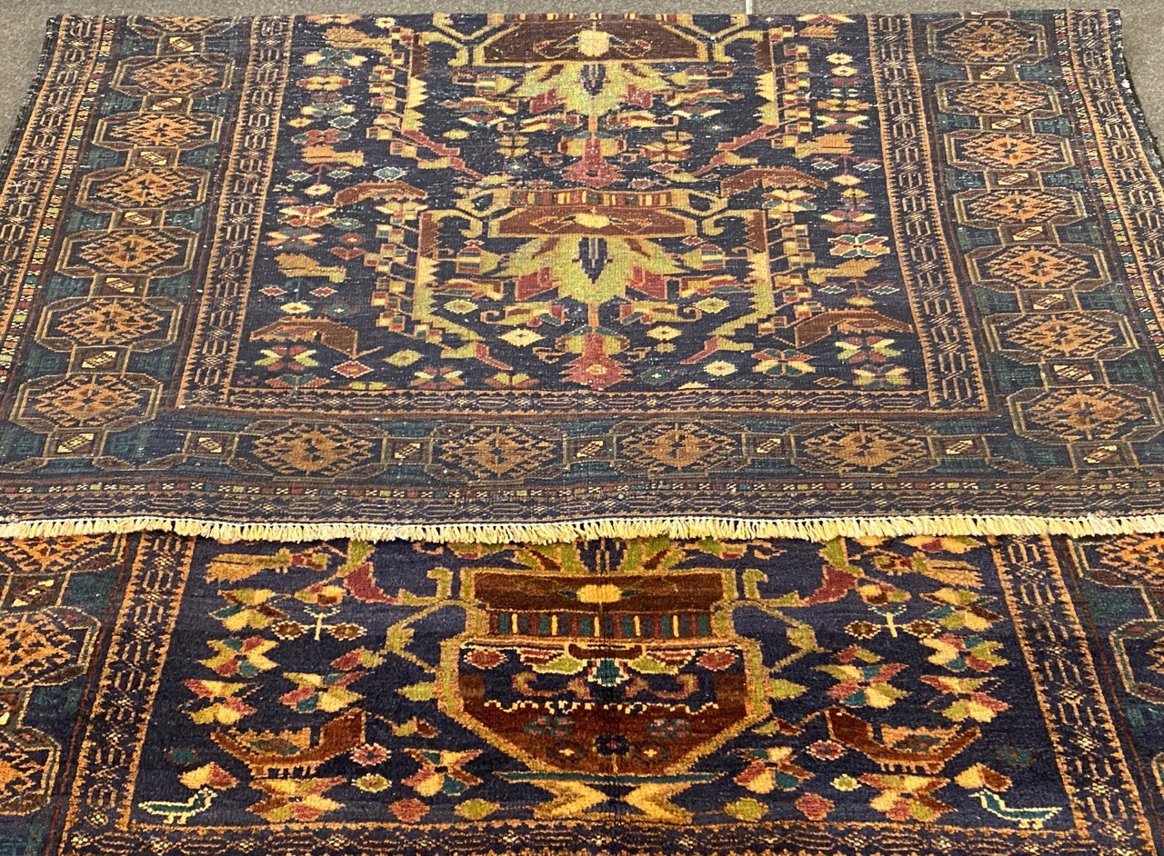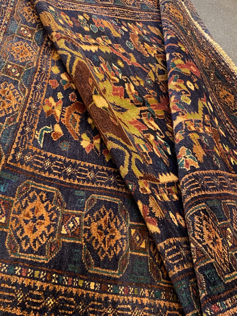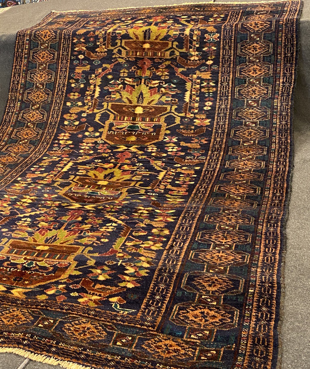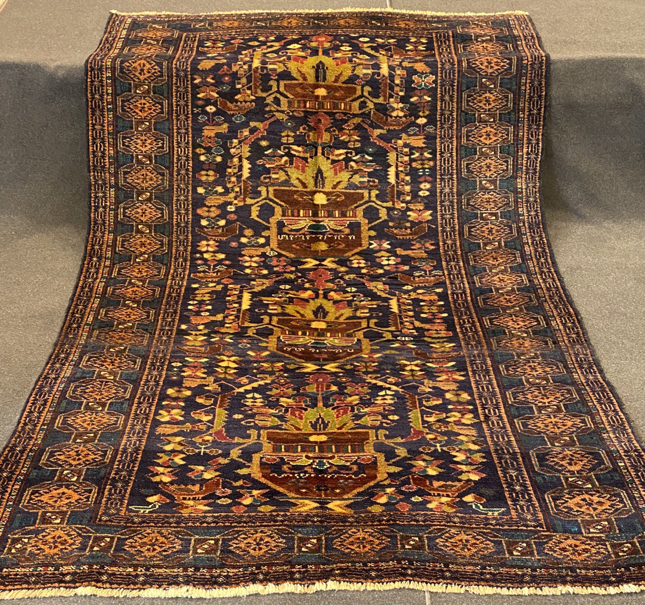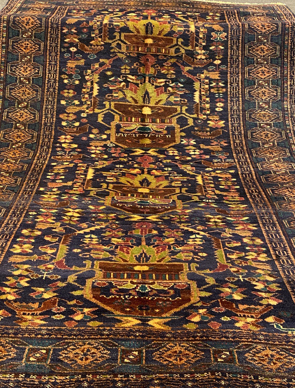 Un inconsueto e raro esemplare Zabol di vecchia manifattura ornato da un motivo floreale stilizzato a vaso sovrapposti su un fondo blu. Questo manufatto è munito dell’attestato di provenienza e di autenticità.